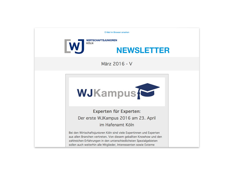 Deutschland (WJD) bildet als Nachwuchsorganisation junger Unternehmer und Führungskräfte ein dichtes Netz von Kreisen und Kontakten mit deutschlandweit über 12.000 Mitgliedern aus sämtlichen Branchen der Wirtschaft. Das Engagement der bis zu 40-jährigen Kölner Wirtschaftsjunioren steht ganz im Zeichen einer sozialen Marktwirtschaft in einer lebenswerten Umwelt sowie der Weiterentwicklung dieser Instanzen. Die Wirtschaftsjunioren setzen sich für die Akzeptanz unternehmerischen Handelns in Deutschland ein. Das Ziel ist die Sicherung der Wettbewerbsfähigkeit unseres Landes.